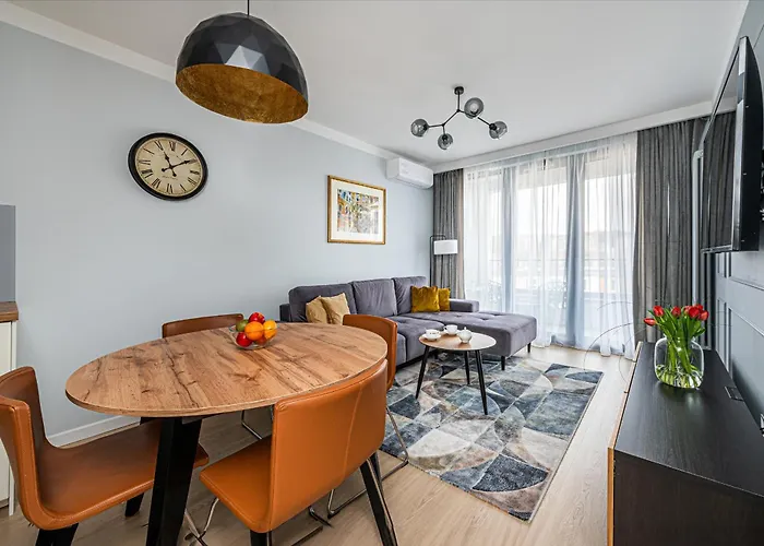 The 63 m^2 Atena Premium - Billberry Apartments features views of the city and is situated merely an 11-minute walk from Polish Naval Museum. Staying in this 1-bedroom apartment, nestled within walking distance of Skwer Kosciuszki Park, guests can relax on a terrace.